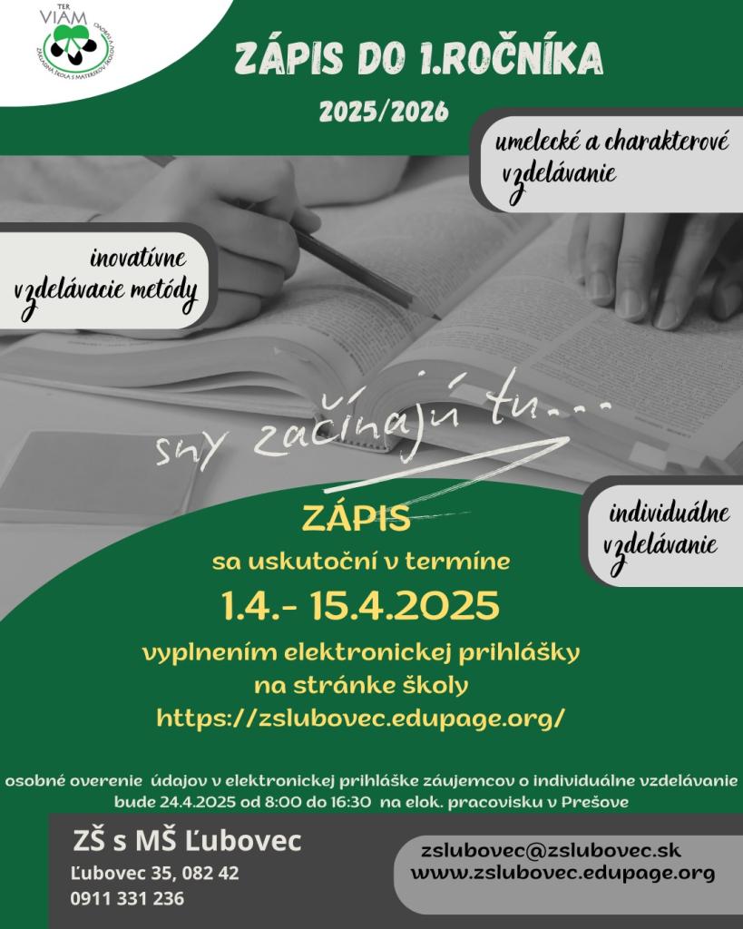 Zápis do 1. ročníka na ZŠ s MŠ Ľubovec pre školský rok 2025/2026 prebieha od 1. do 15. apríla 2025. Záujemcovia môžu vyplniť elektronickú prihlášku na stránke školy https://zslubovec.edupage.org/ .